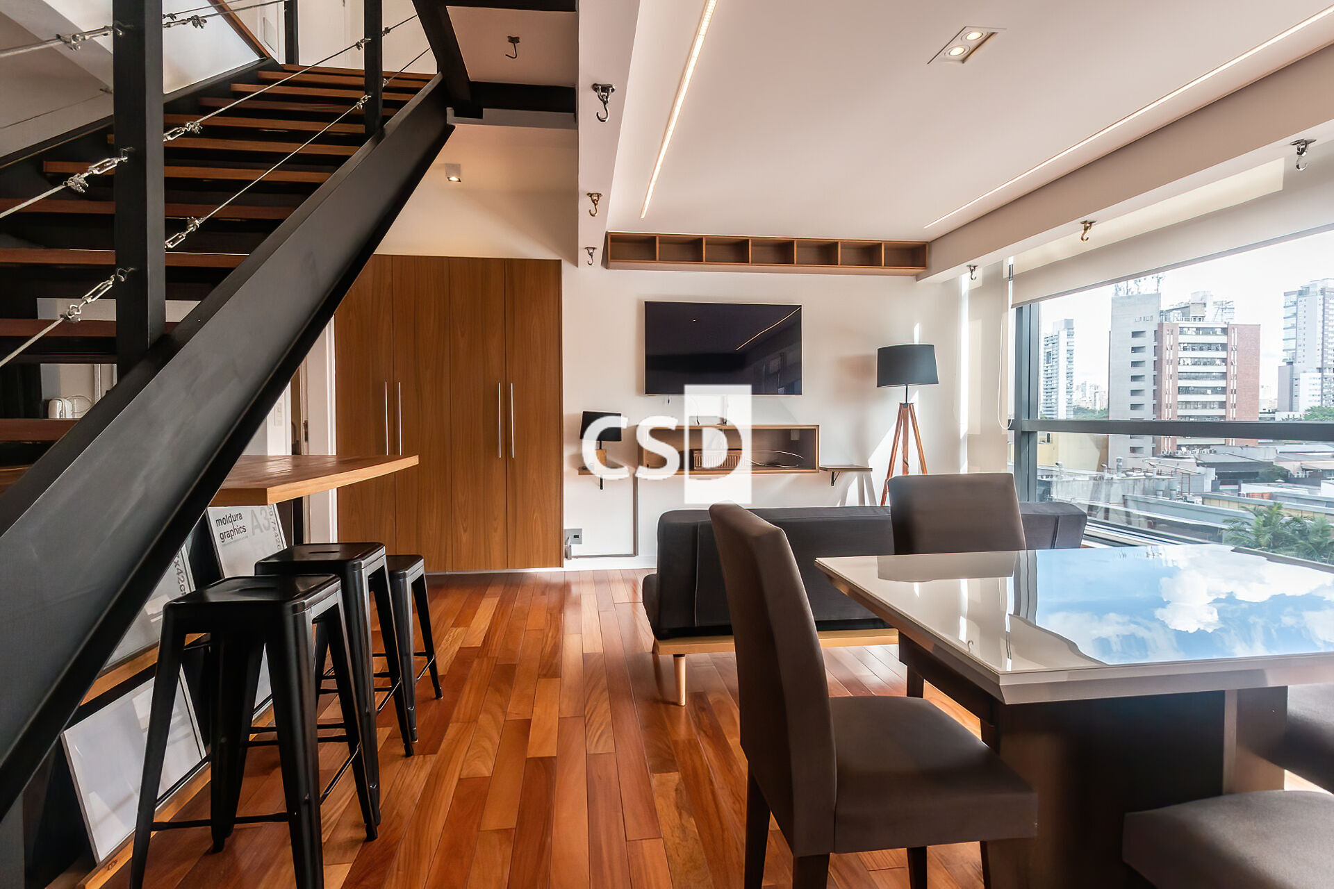 Descrição: Apartamento duplex mobiliado e totalmente equipado. O pavimento inferior tem uma sala para 2 ambientes com amplas janelas. Elas proporcionam ótima iluminação natural de manhã e de tarde. Cozinha integrada completa com armários. Pavimento superior conta com uma ampla suíte, rica em armários. Ar condicionado nos ambientes e cortinas Black out Inúmeras tomadas elétricas todas com entrada pra usb - cabeamento interno - internet fibra vivo com wifi de alta potência.